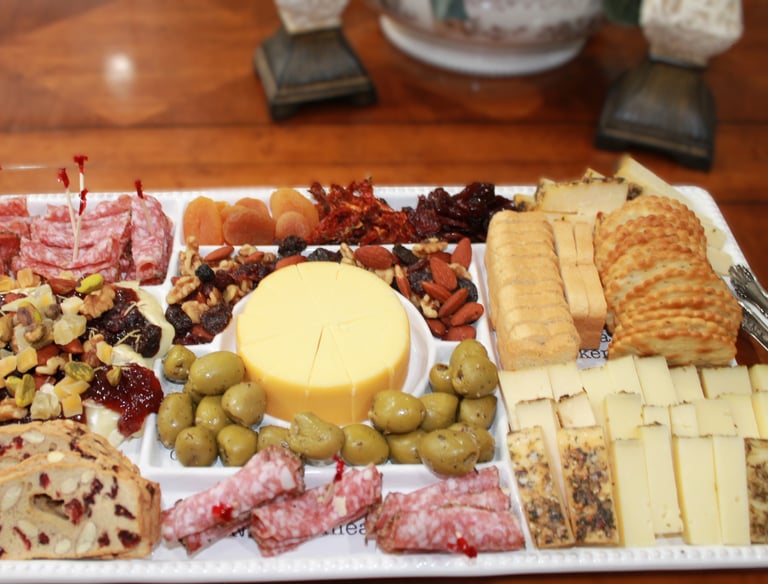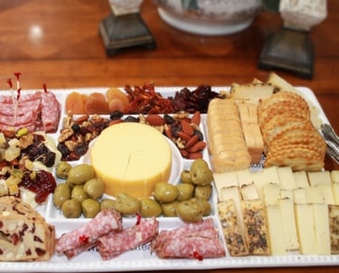 Elevated Charcuterie boards including smoked gouda, smoked brie smothered in our hand crafted, one of a kind jams, dried fruits, gourmet crackers and breads, nuts, olives and more